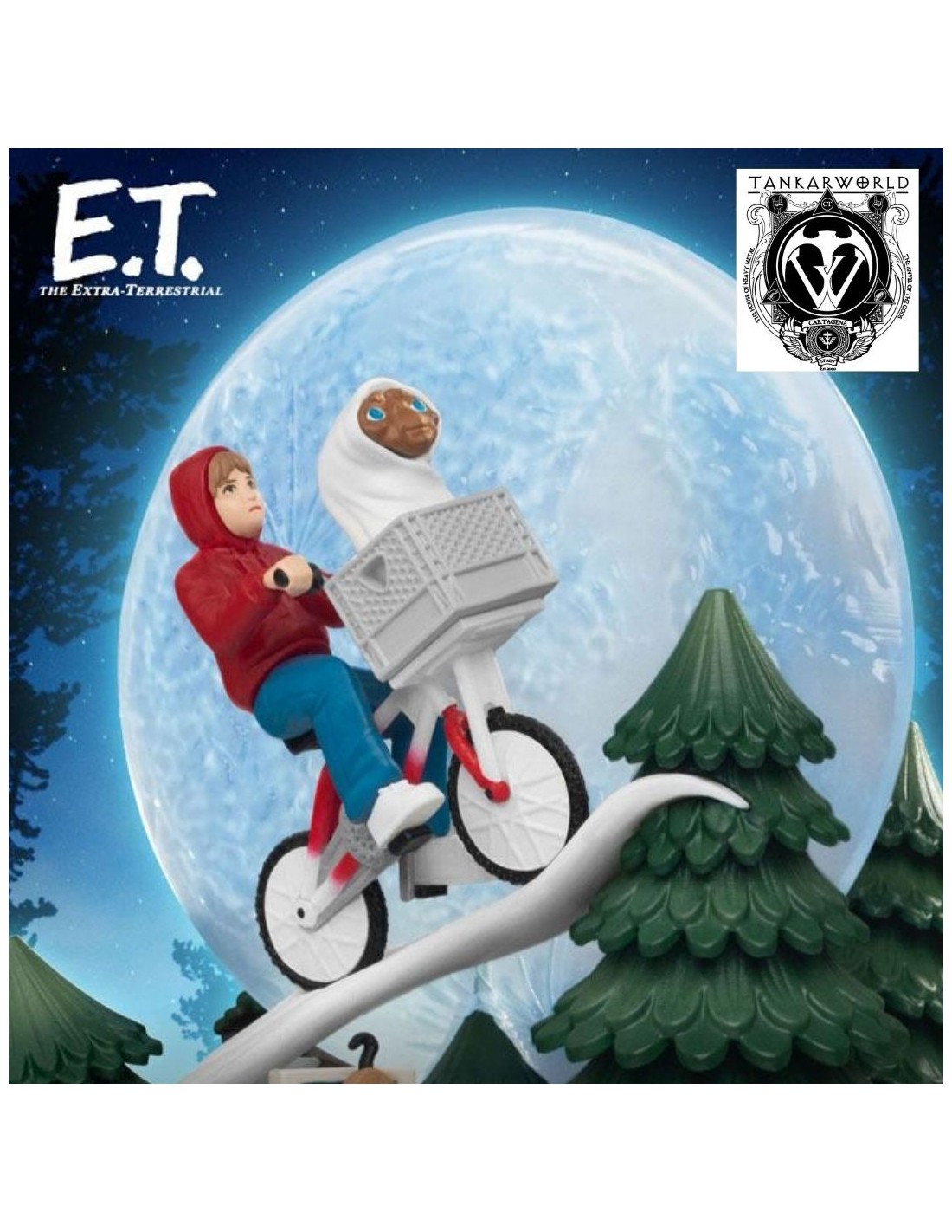 En esta ocasión, tenemos un conjunto de unos 15 cm, con unas figuras llenas de detalles, agrupadas en torno a un diorama, y en las que los protagonistas son Elliot y el propio E.T., montados en la bicicleta, volando y con la luna llena de fondo, en una de las escenas más icónicas de la historia del cine.