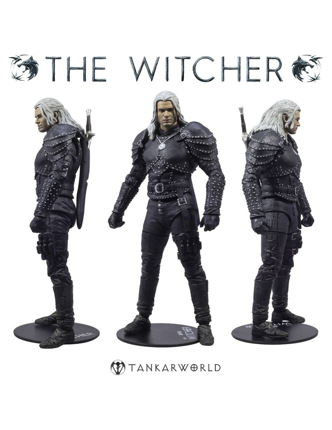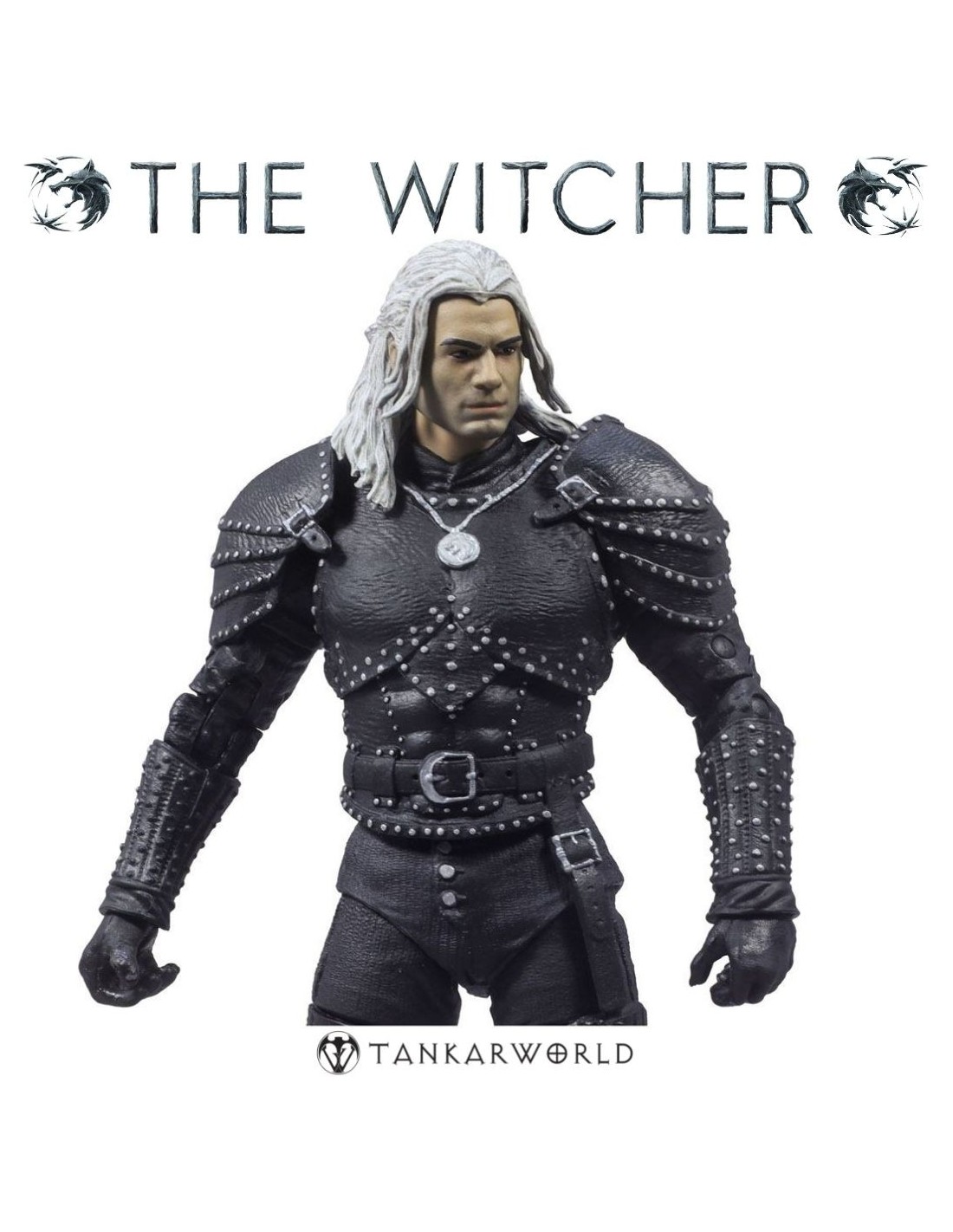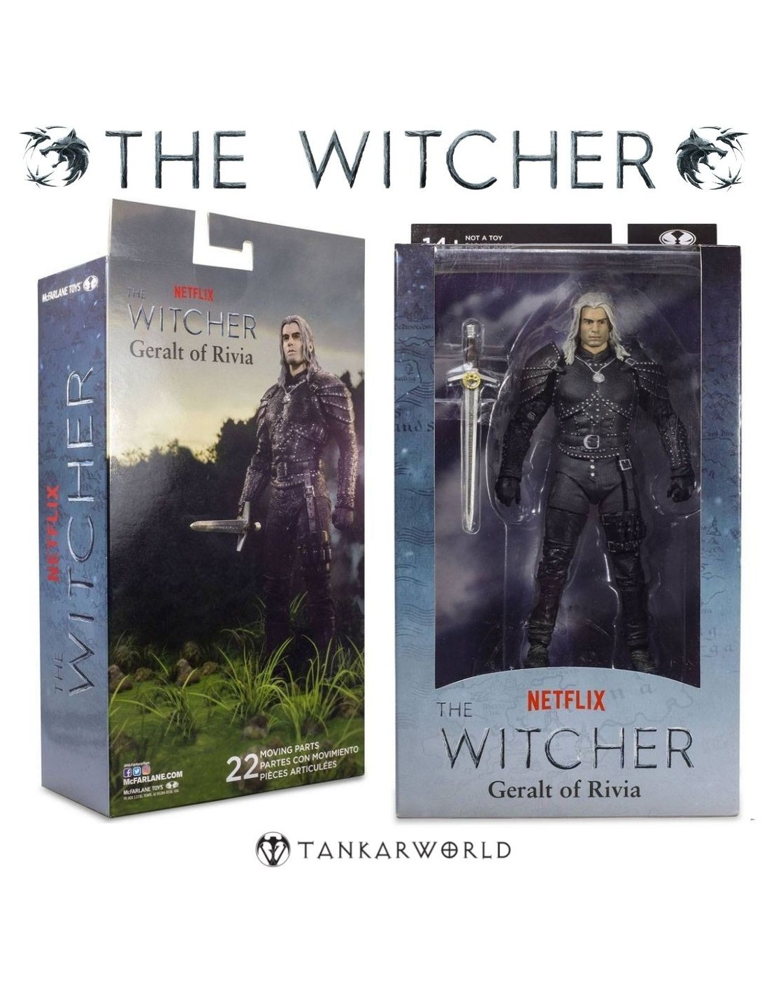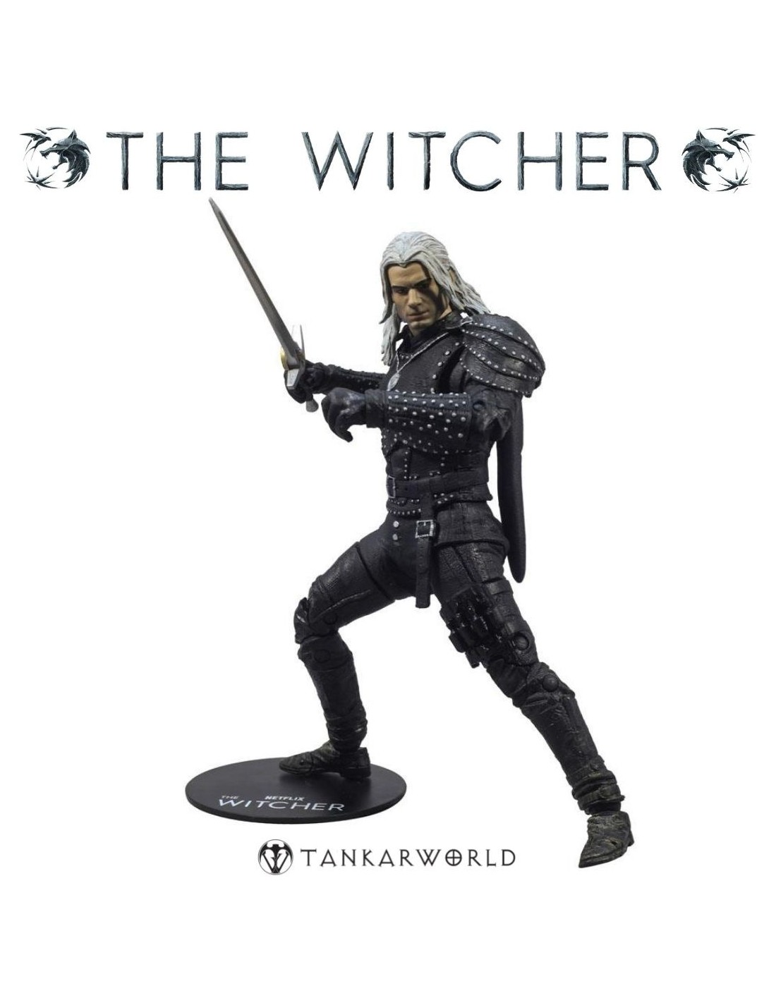 Esta figura de 18 cm, fabricada por McFarlane Toys, destaca por su esculpido preciso, acabados realistas y múltiples puntos de articulación que permiten recrear con fidelidad las poses más icónicas del brujo.
