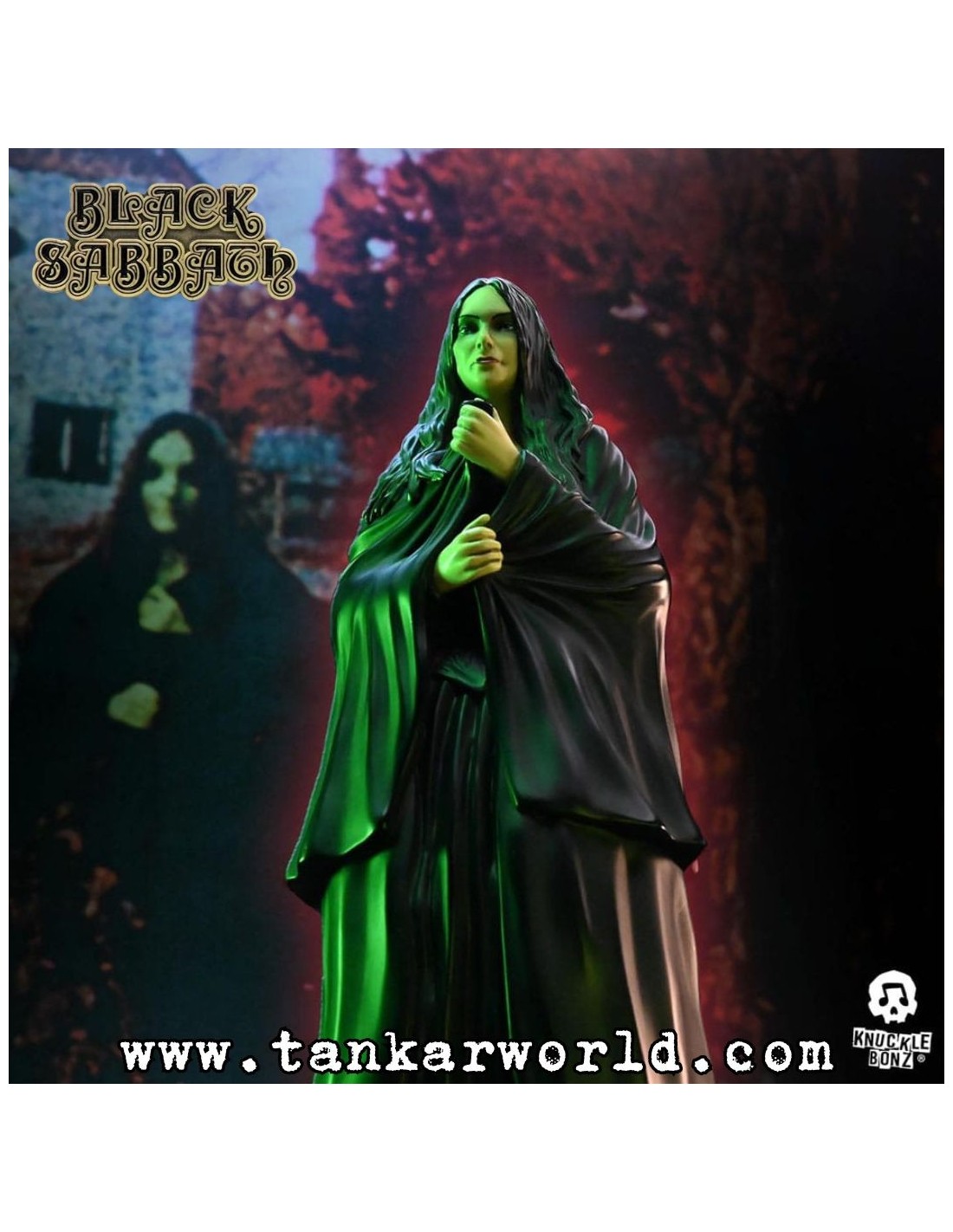 Esta impresionante estatua de 22 cm rinde homenaje a la mítica banda pionera del género, Black Sabbath, recreando la icónica portada de su álbum debut de 1970. Con detalles increíblemente trabajados, captura la esencia mística y oscura que definió el sonido y la imagen de la banda.