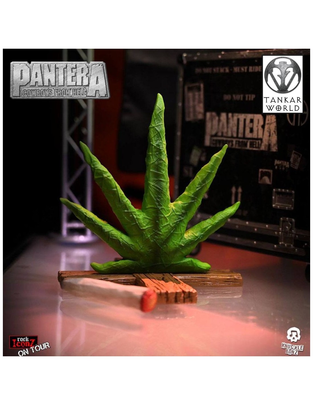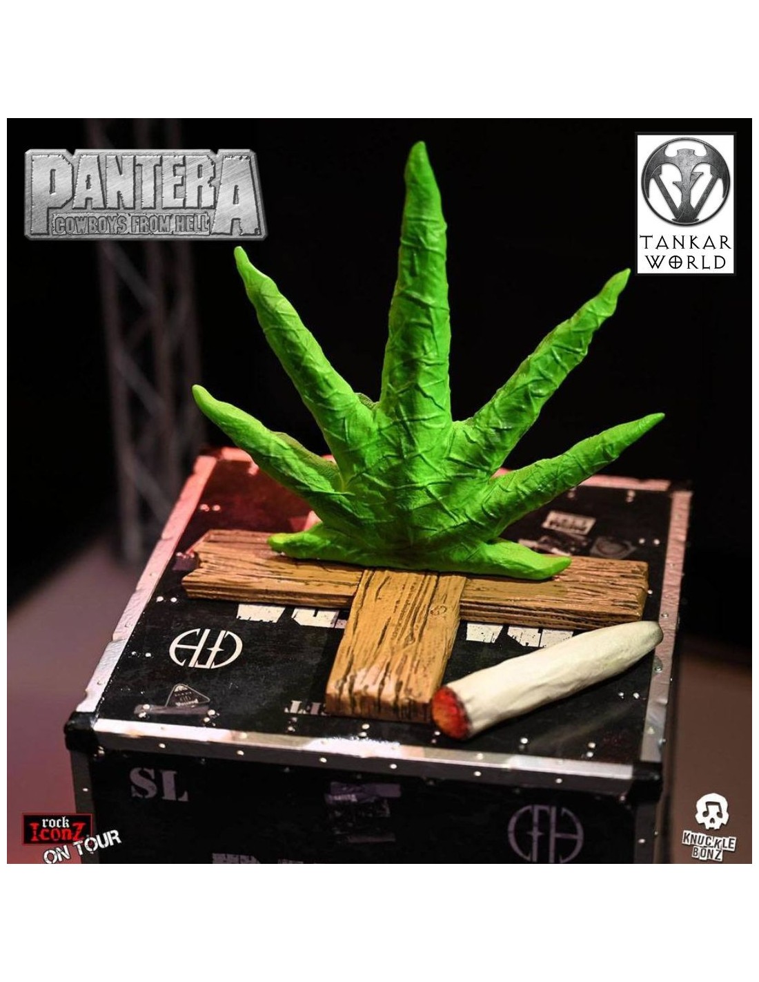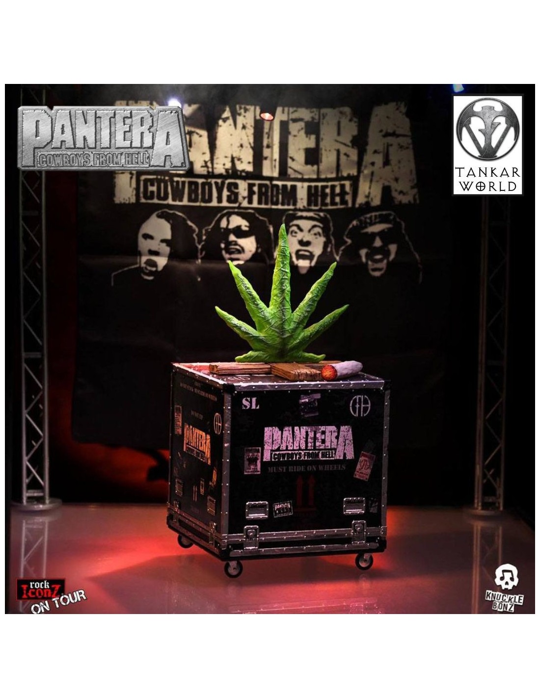 "Caja de almacenamiento de gira" (Road Case) de Pantera de su gira del disco Cowboys From Hell, que lleva dentro un telón de fondo del escenario de tela, una figura de una hoja de marihuana como sacaban a los escenarios, y un porro.