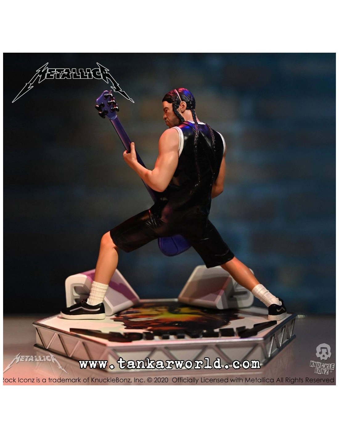 Sumérgete en la potencia del bajo con esta increíble figura de Robert Trujillo, el inconfundible bajista de Metallica, representado con toda su energía característica en esta estatua de la línea Rock Iconz de KnuckleBonz.
