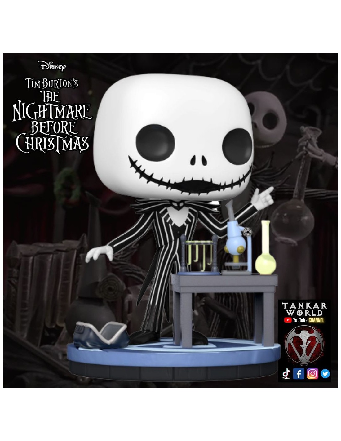 Este Funko Pop! presenta a Jack Skellington con su característico traje de esqueleto mientras trabaja en su laboratorio.