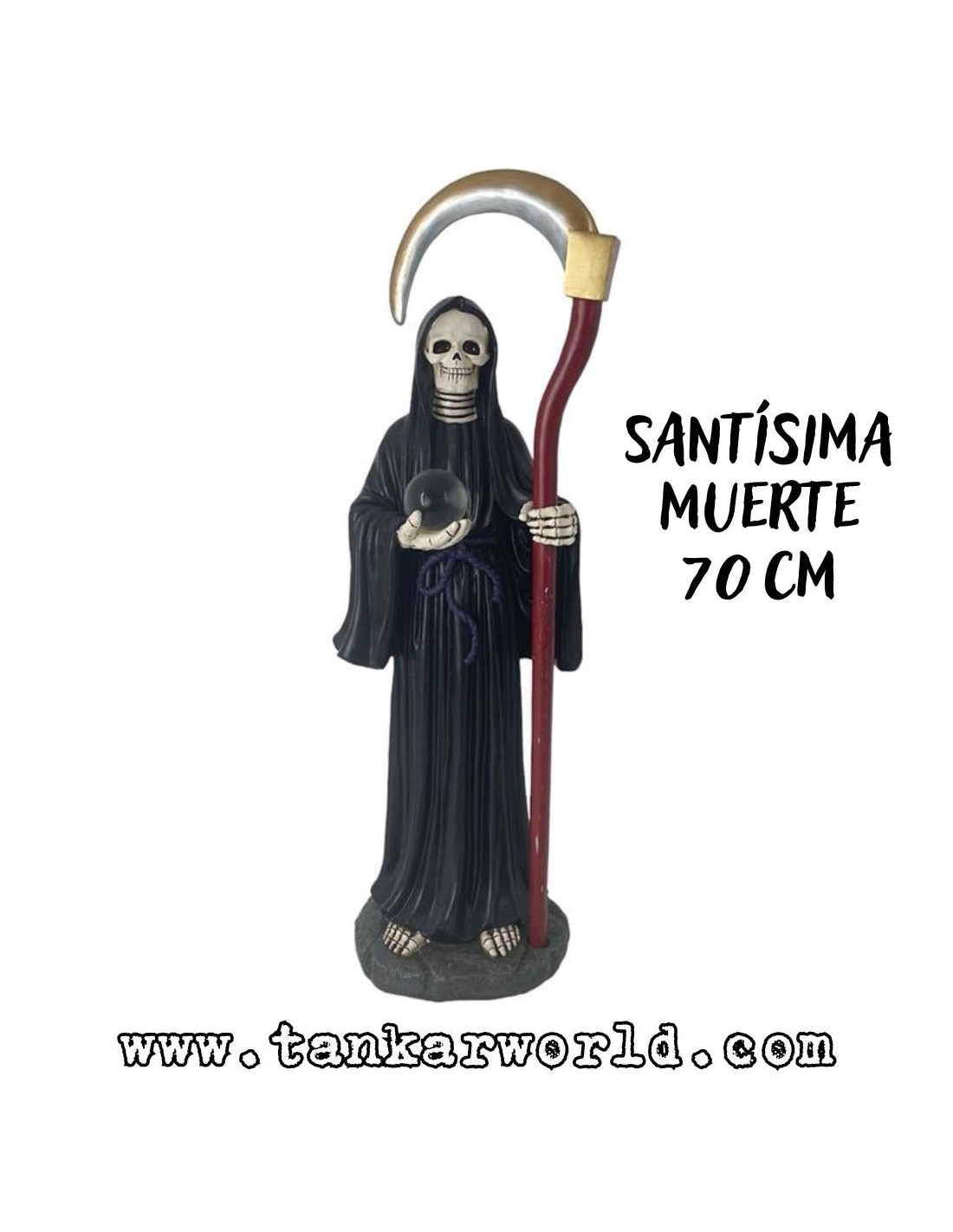 Imponente figura de la Santísima Muerte con manto negro y bola de cristal, elaborada en resina de alta calidad. Con una altura de 70 cm, es una pieza destacada, ideal para altares, espacios devocionales o colecciones espirituales.