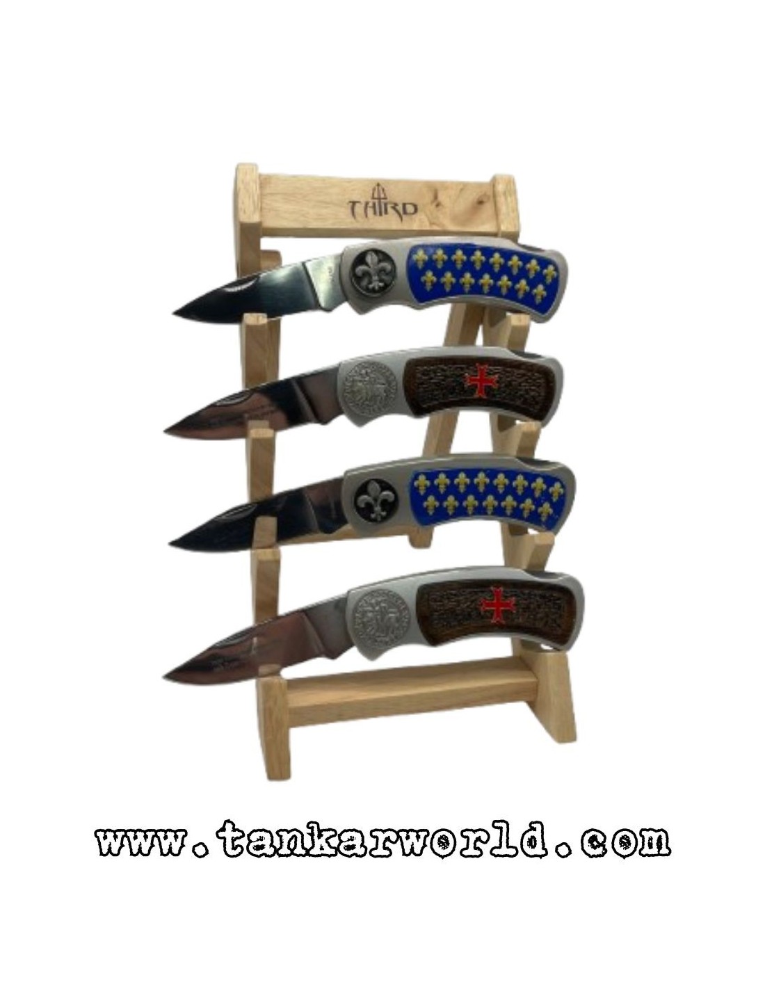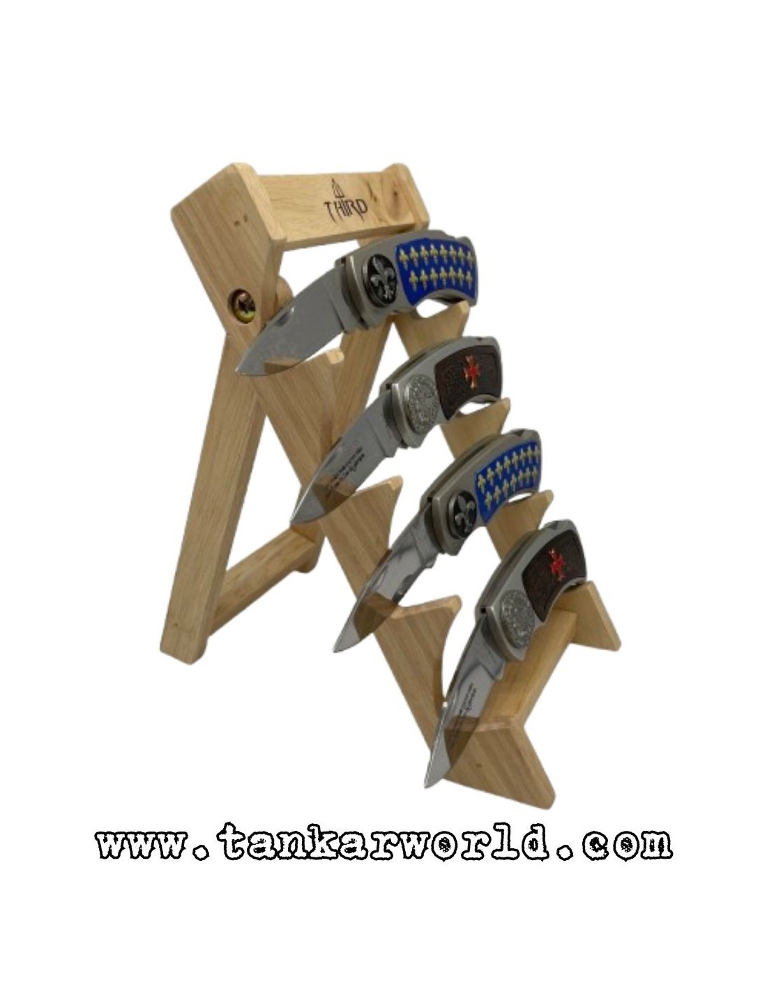 Este elegante expositor de madera está diseñado para presentar hasta 4 navajas de forma segura y estilizada. Su estructura robusta y acabado natural lo convierten en la opción ideal para coleccionistas y amantes de la cuchillería.