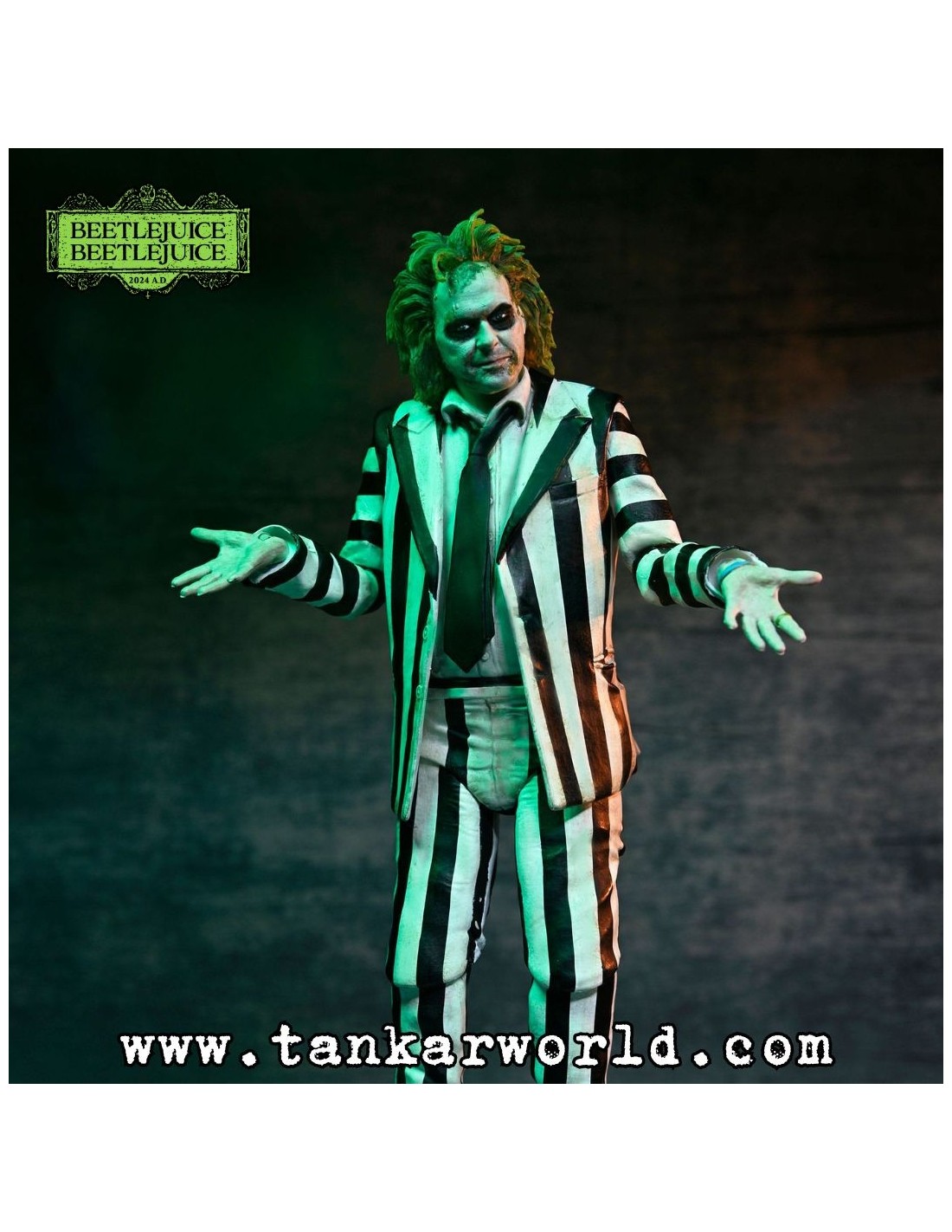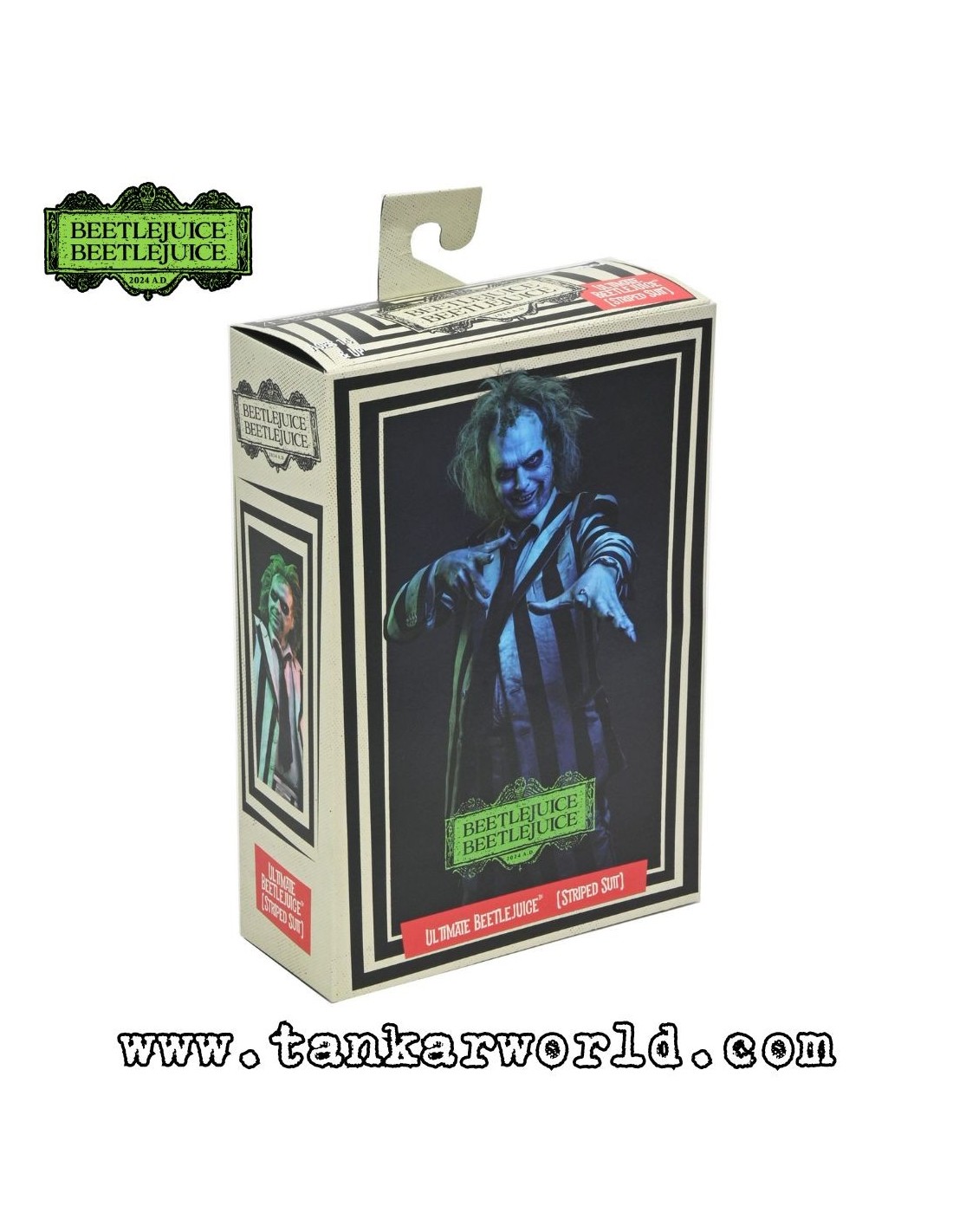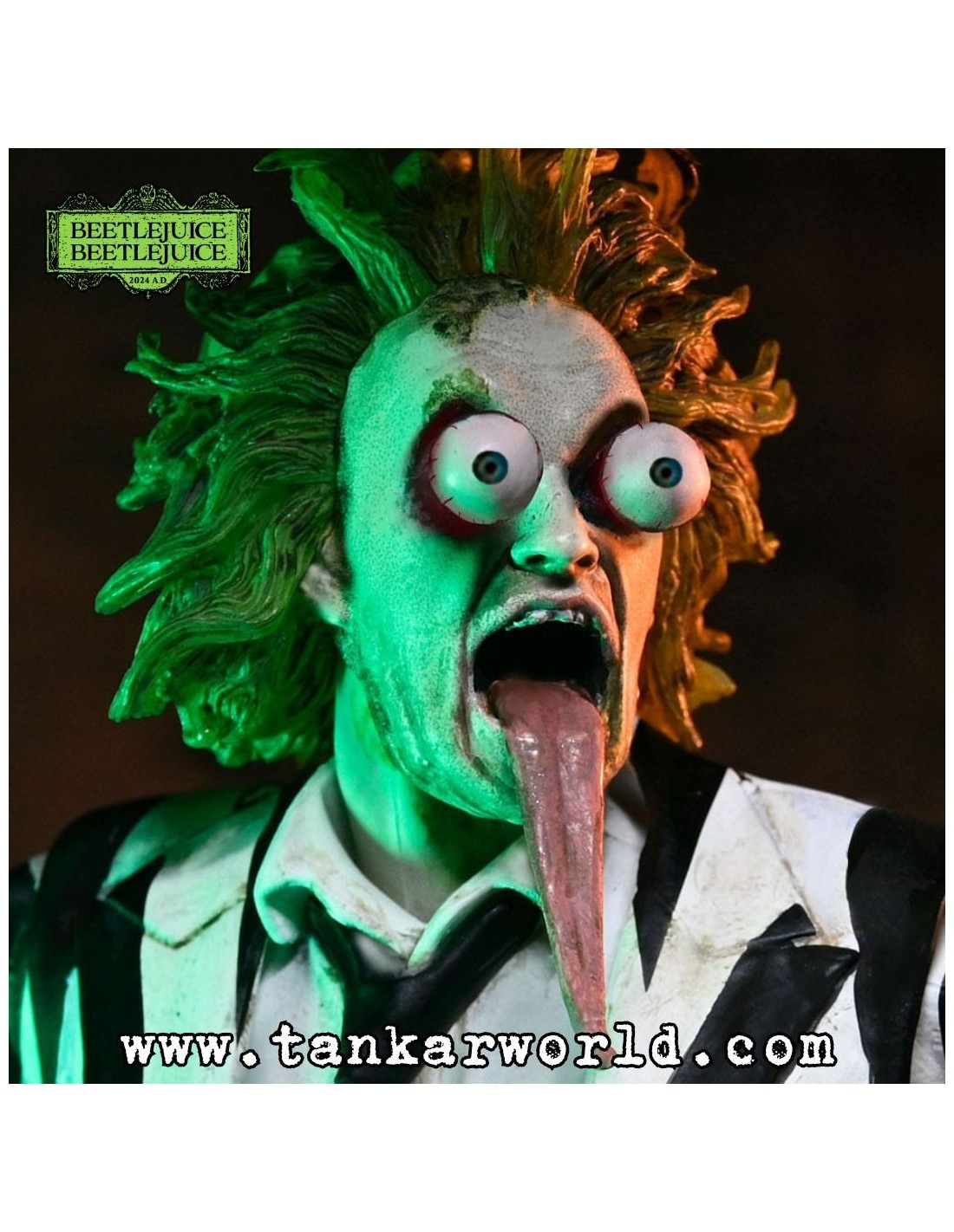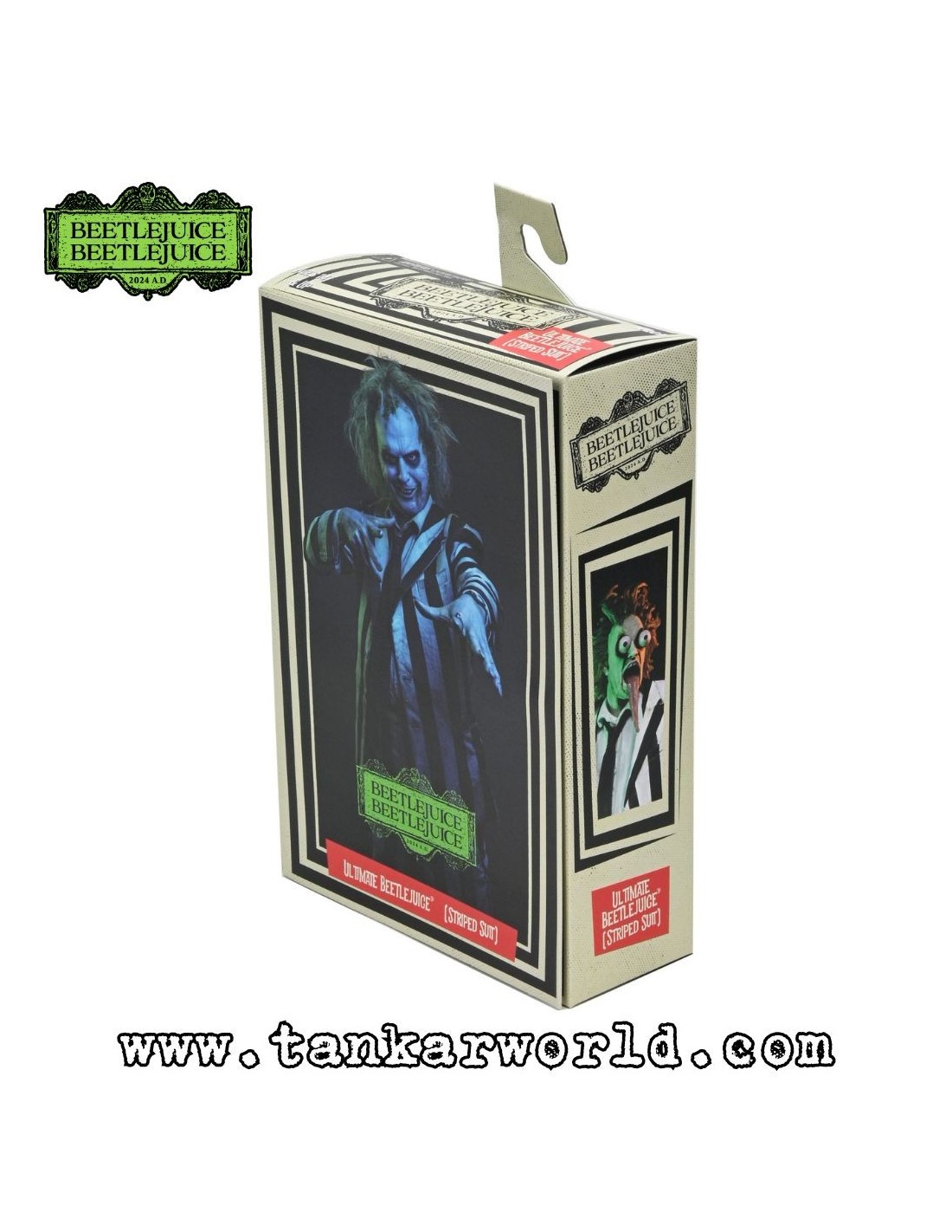 NECA presenta esta figura Ultimate de Beetlejuice con su icónico traje de rayas, inspirada en la próxima película “Beetlejuice Beetlejuice”.