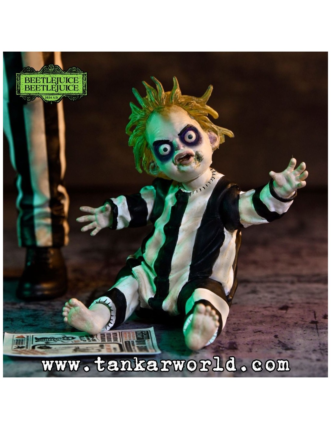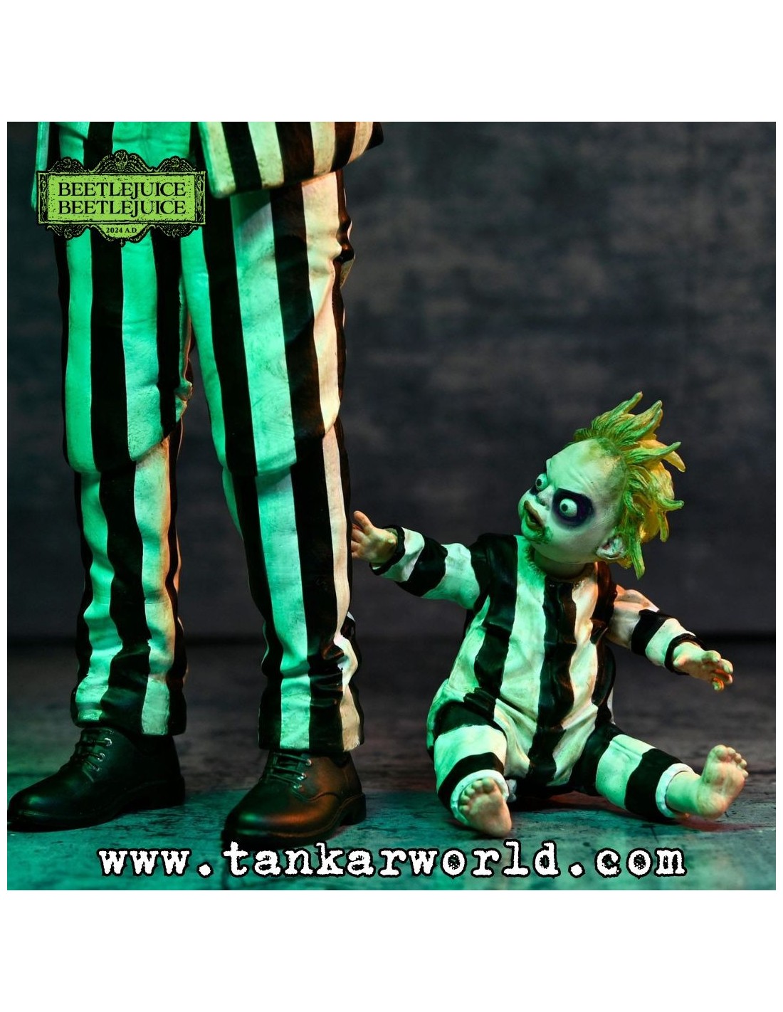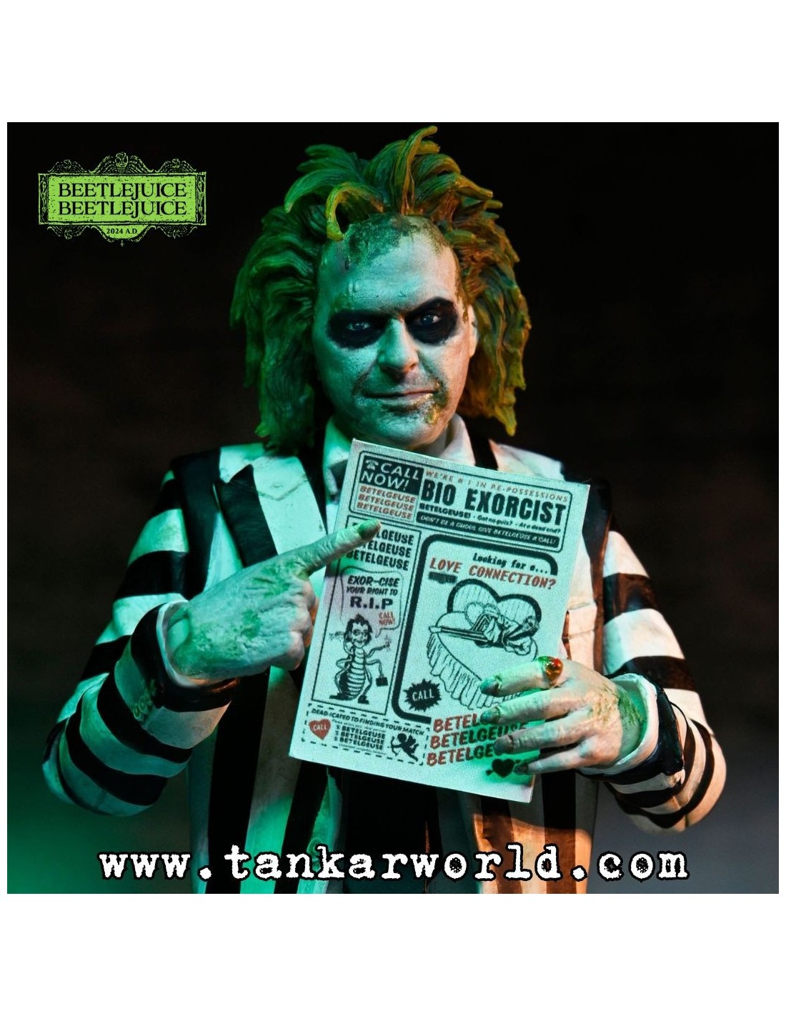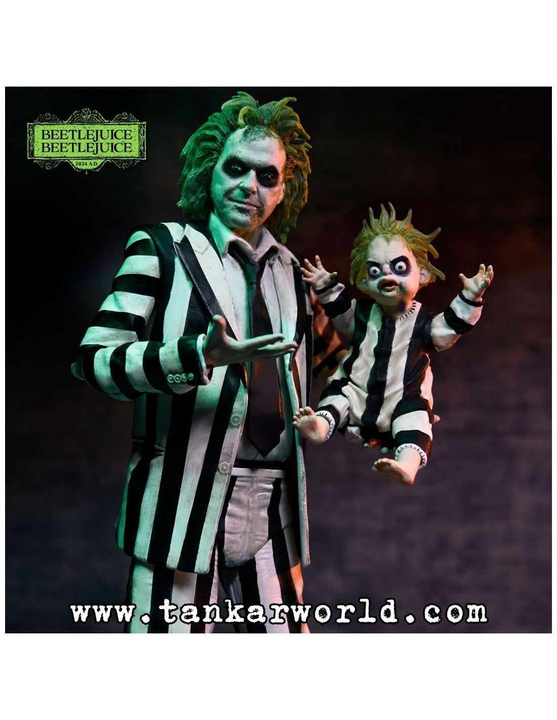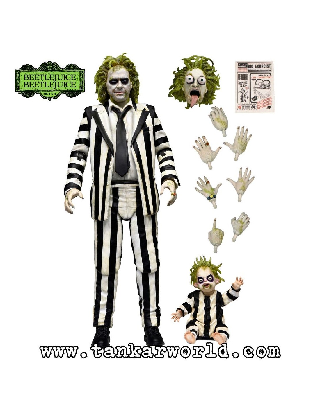 NECA presenta esta figura Ultimate de Beetlejuice con su icónico traje de rayas, inspirada en la próxima película “Beetlejuice Beetlejuice”.