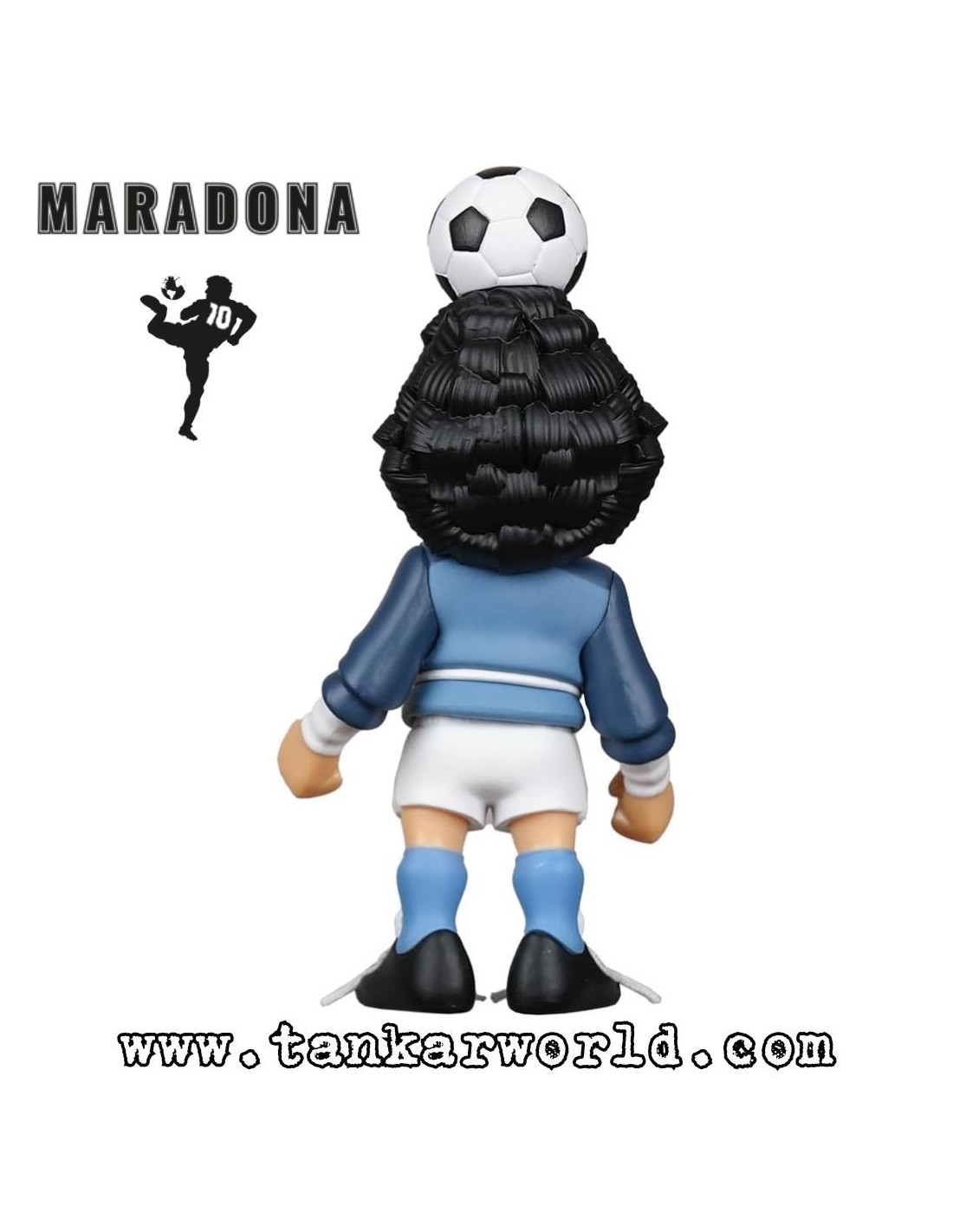 La figura reproduce a Maradona con la icónica equipación de la selección argentina, capturando su estilo inconfundible y su presencia histórica sobre el terreno de juego. Fabricada en vinilo de alta calidad, presenta un acabado cuidado y fiel al personaje, ideal tanto para coleccionistas como para aficionados al fútbol.