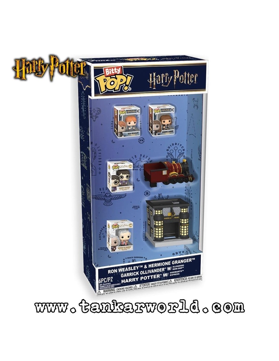 Bitty Pop! - Ron Weasley - Hermione Granger - Garrick Ollivaner with Ollivanders Wand Shop - Harry Potter with Hogwarts Express - Hogwarts Express - Ollivanders Wand - Pack 6 figuras
