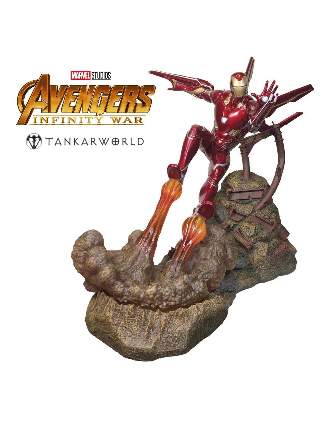 Estatua de resina de Iron Man con su armadura MK50 aterrizando sobre una pila de escombros.
