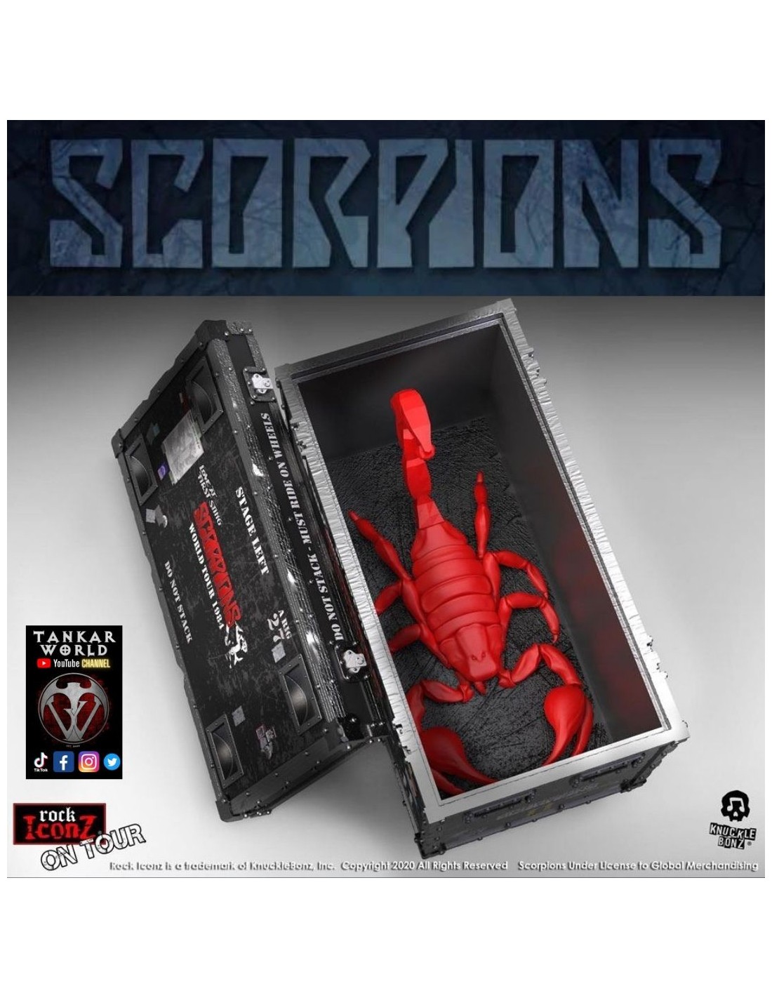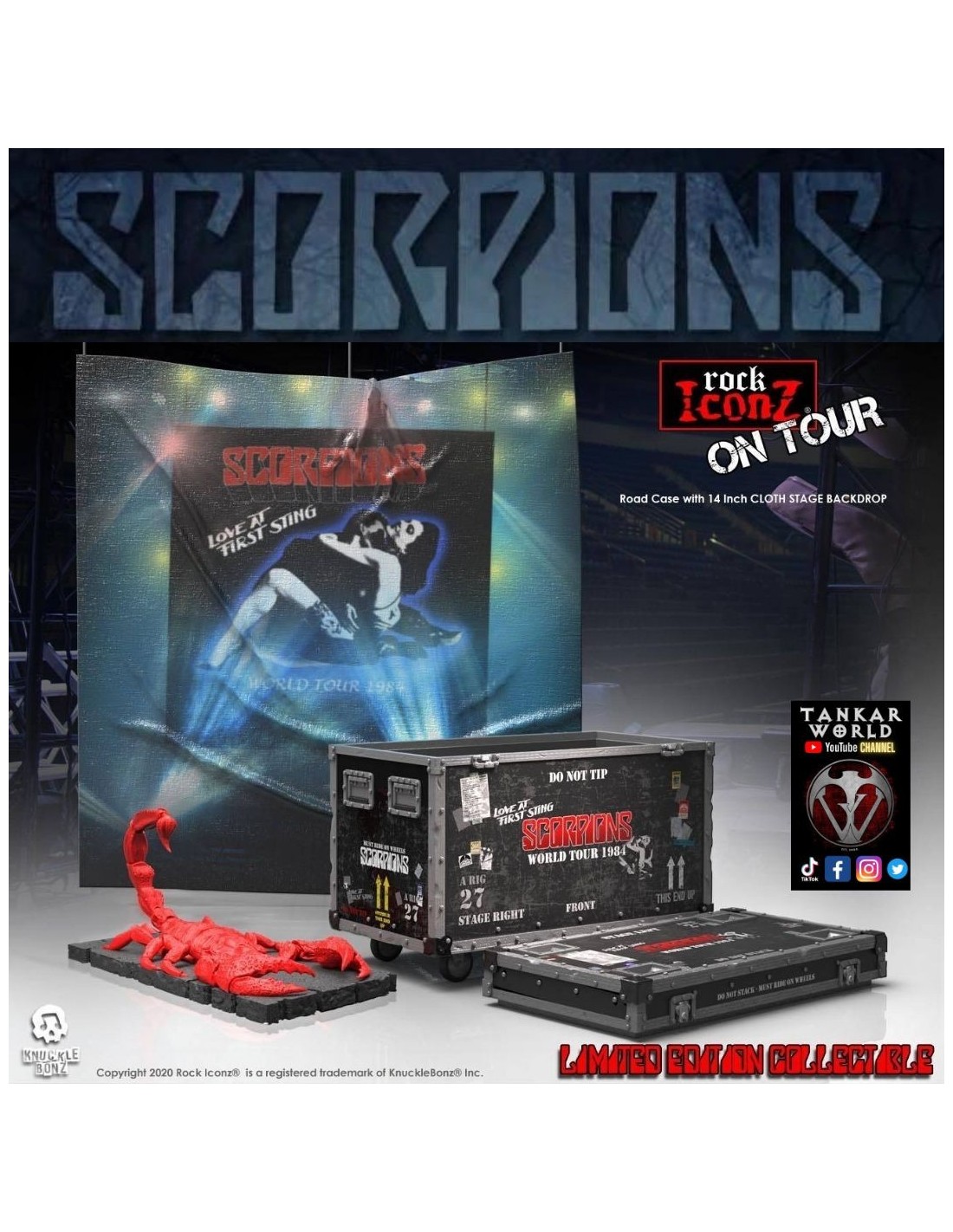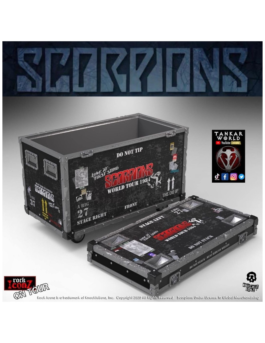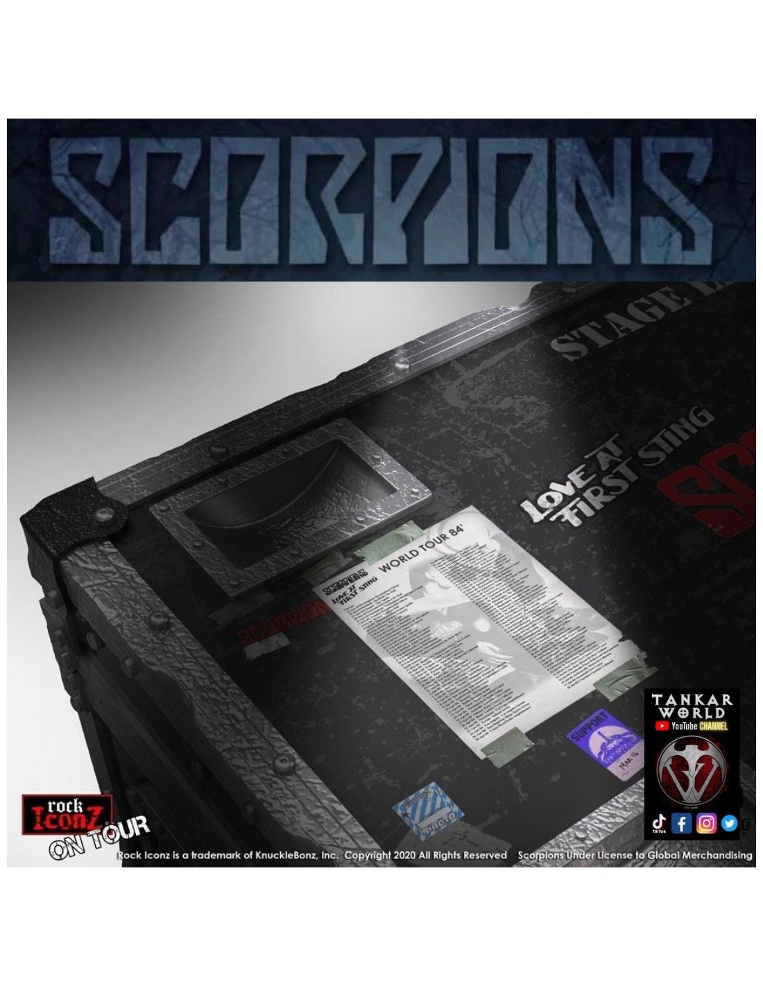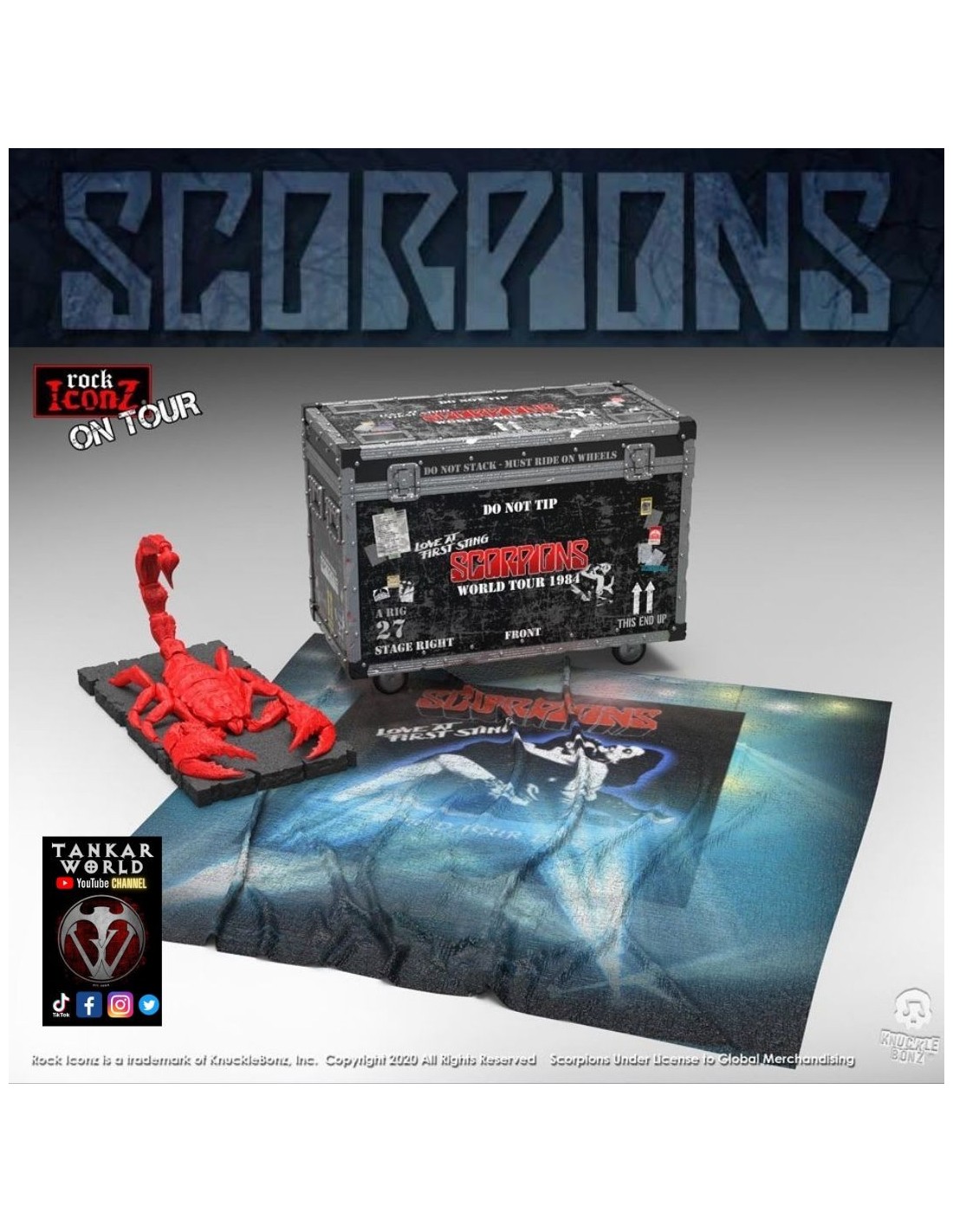 Revive esta gloriosa época de la banda con este set de "cajón de gira/ Road case" donde al abrirlo encontraras un telón de fondo del escenario del "World Tour 1984", una figura de un escorpión de poliresina con base, todo perteneciente a la línea "Rock Ikonz On Tour" de Knucklebonz.