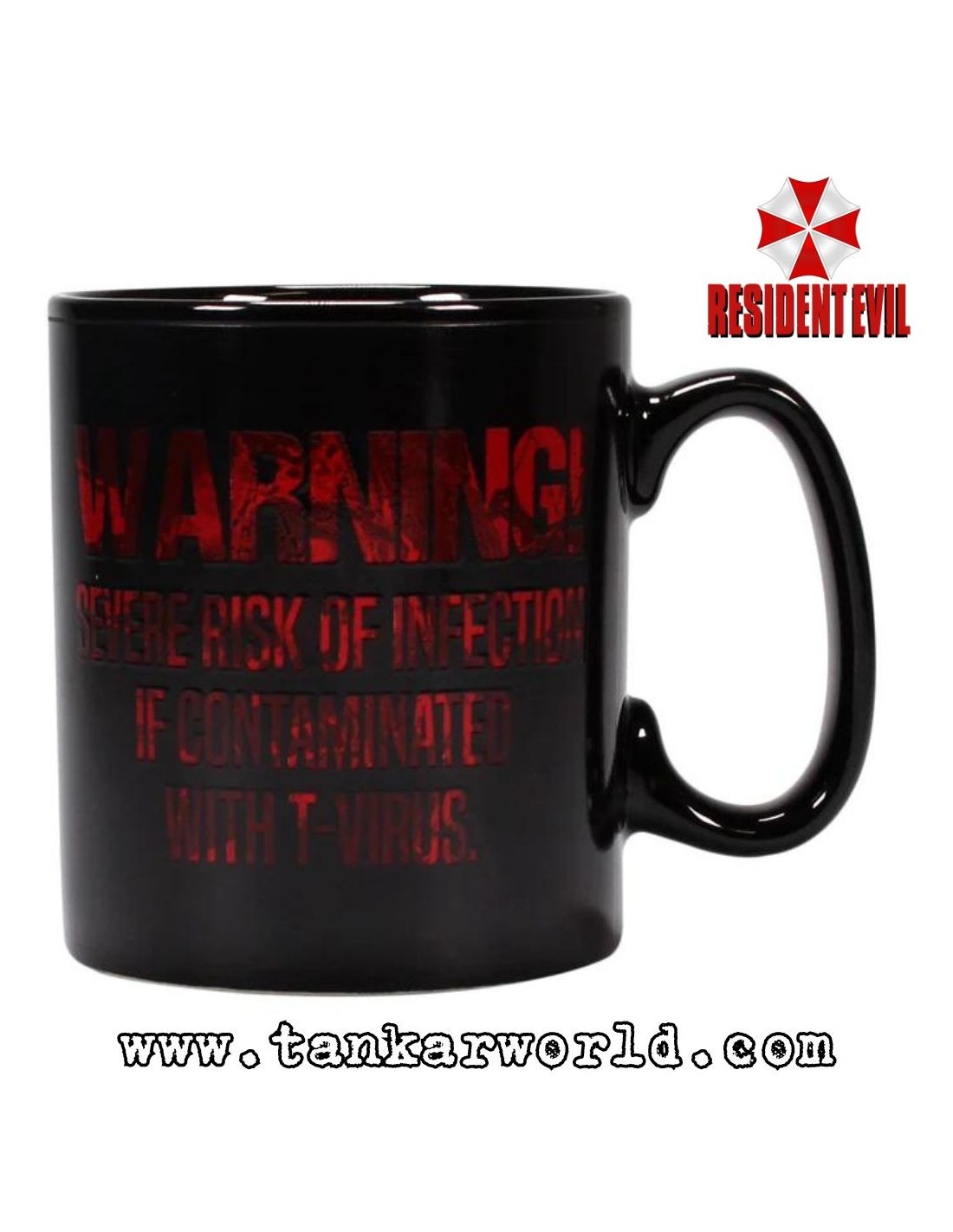 Esta taza de Resident Evil muestra un mensaje de advertencia del Virus T con el símbolo de riesgo biológico en la parte posterior.